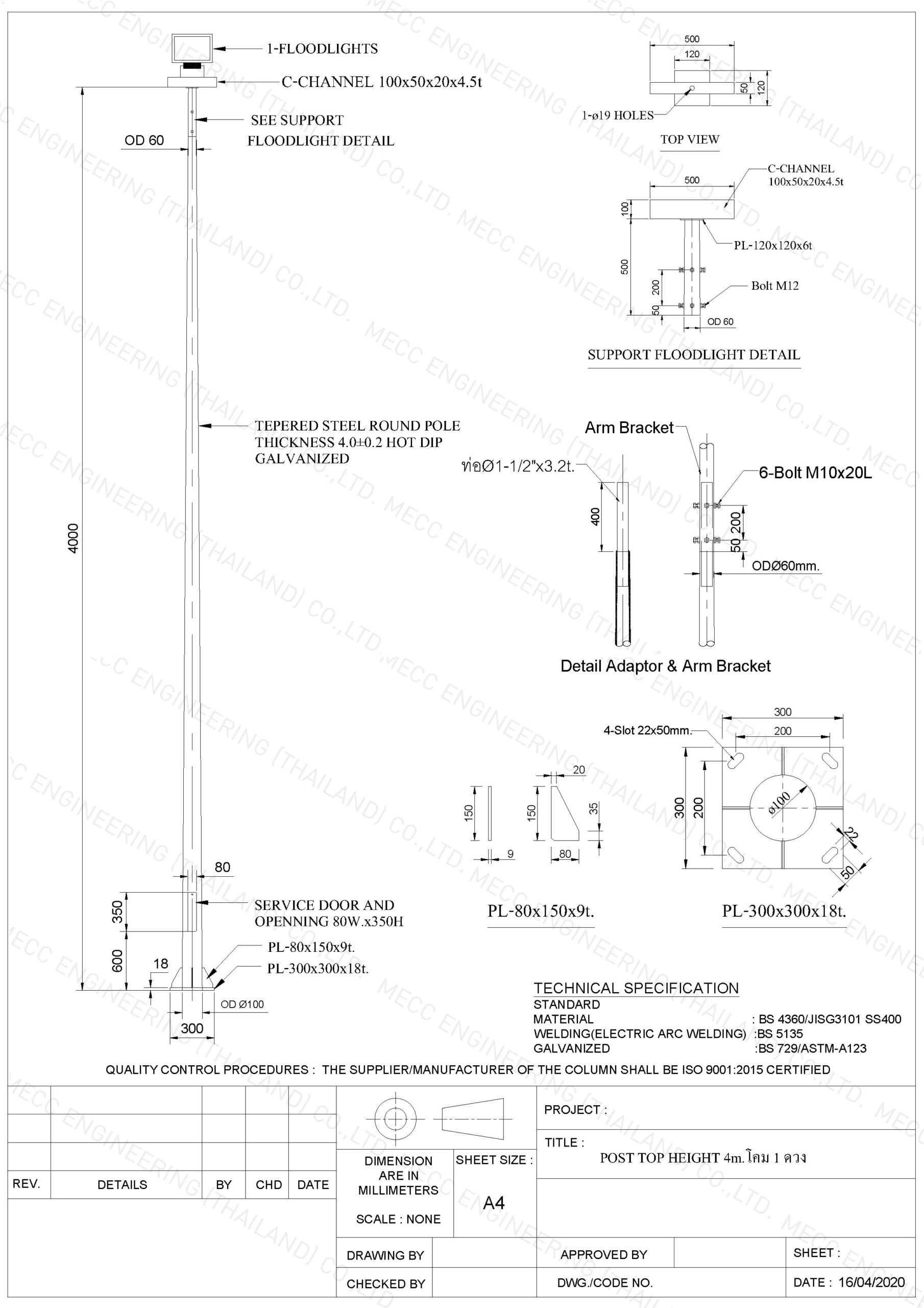 เสาไฟโพสท็อป 4 เมตร กิ่งทีบาร์ สำหรับ 1 โคม ( Lighting Pole 4 meters with T-bar for 1 Head Light)