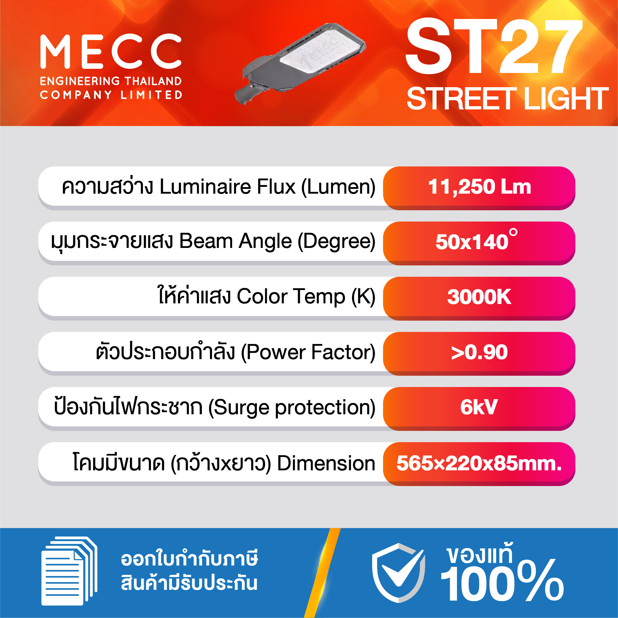 Luminous Flux : ฟลักซ์การส่องสว่าง (Lumen) : 11,250lm
