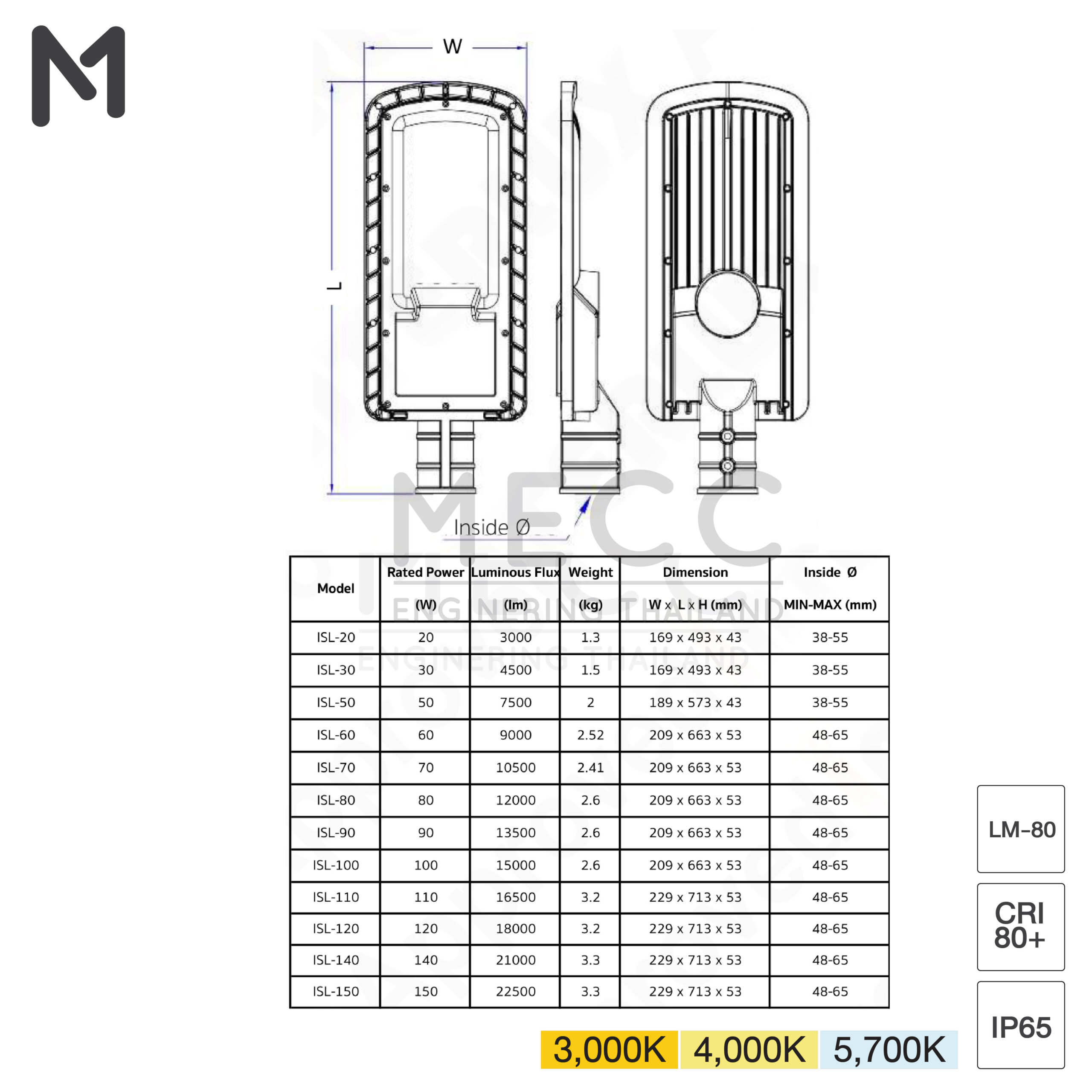 Correlated Color Temperature (ค่าอุณหภูมิสี) : 3000K, 4000K, 5700K