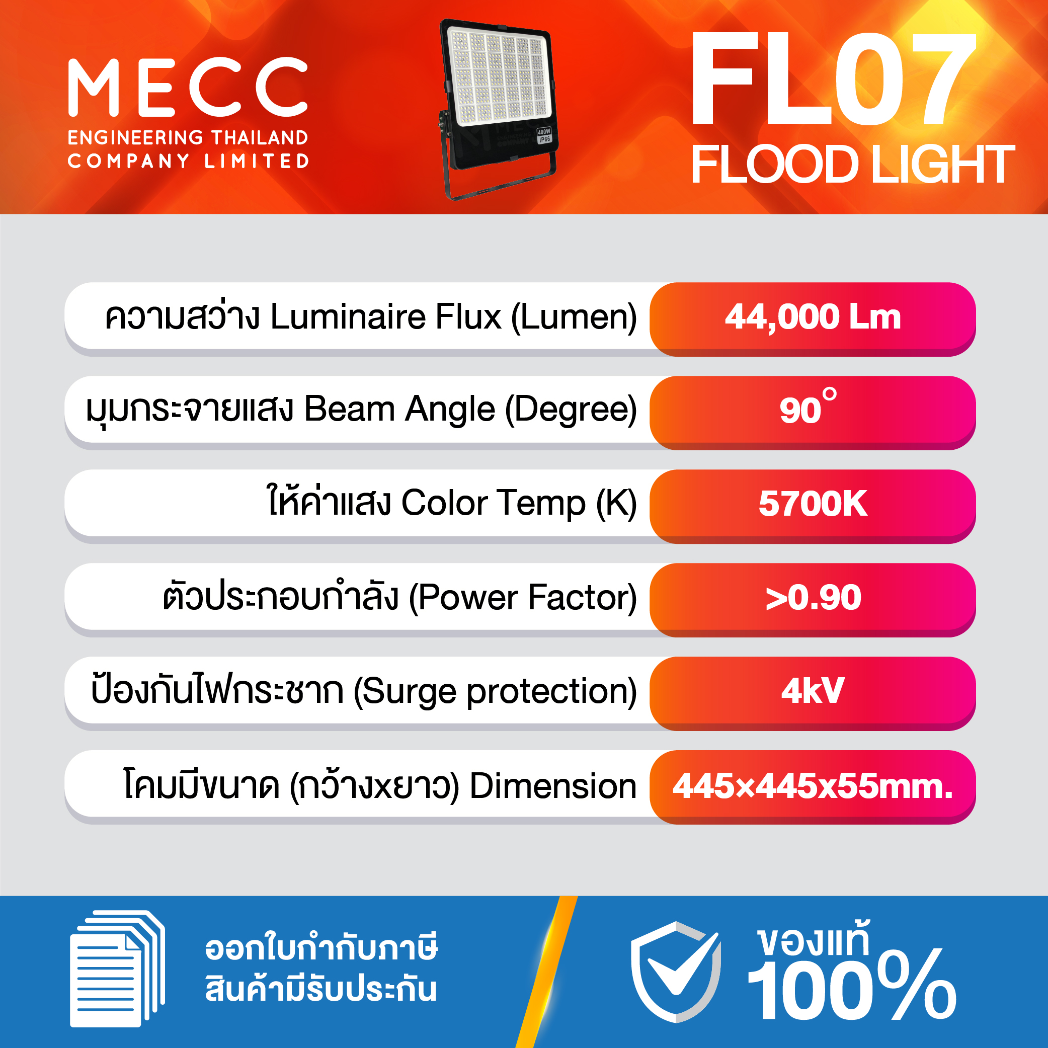 Luminous Flux : ฟลักซ์การส่องสว่าง (Lumen) : 44,000lm