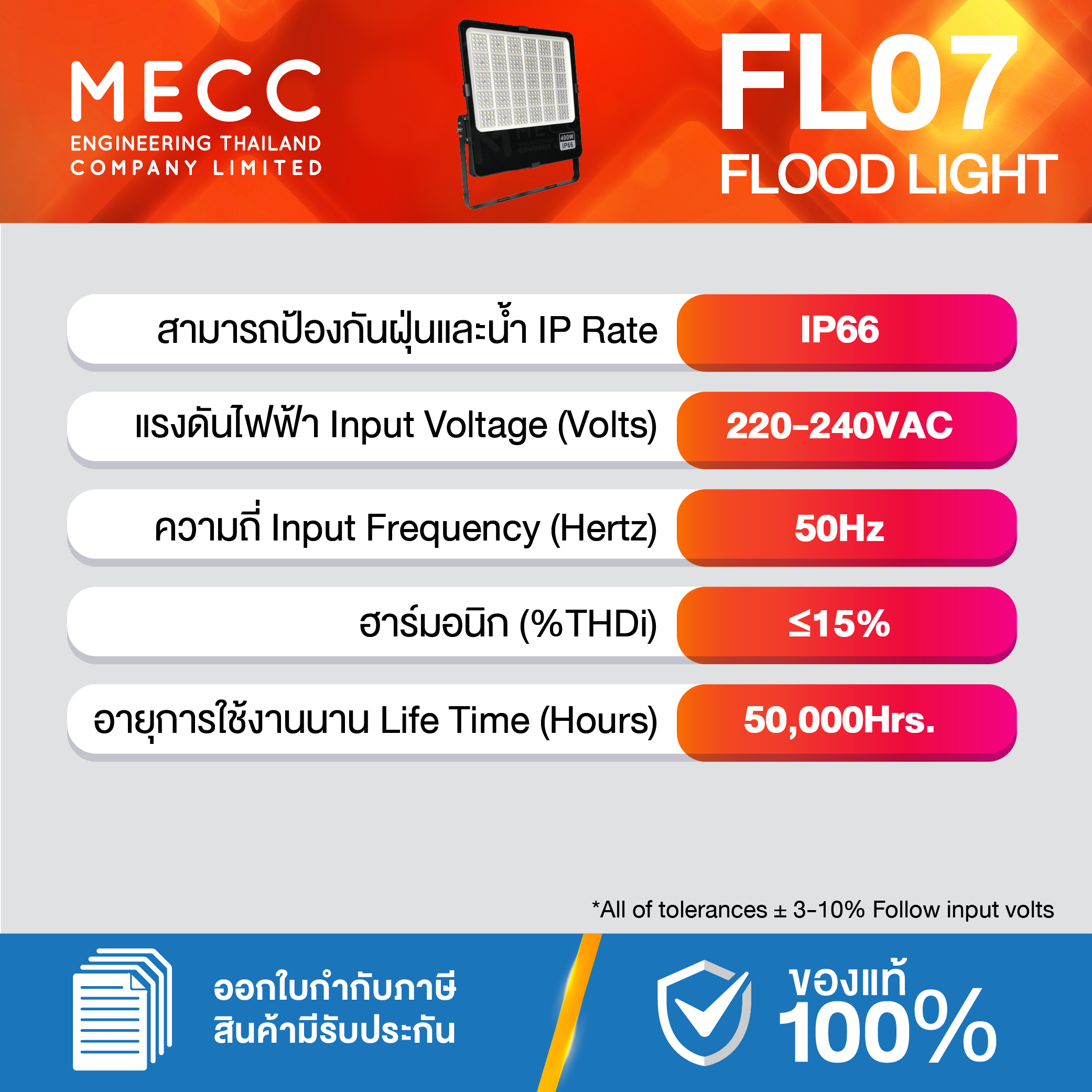 Input Voltages : แรงดันไฟฟ้า : 220-240V