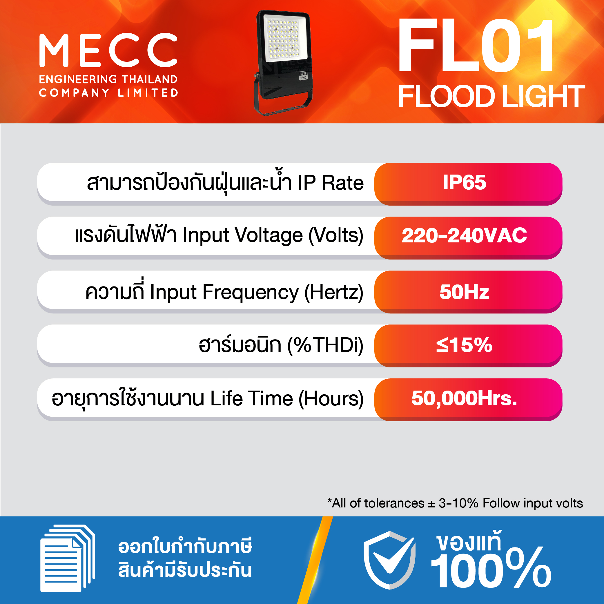 โคมฟลัดไลท์ Floodlight LED 50W 5700K 5,500lm รุ่น FL01 แสงขาว