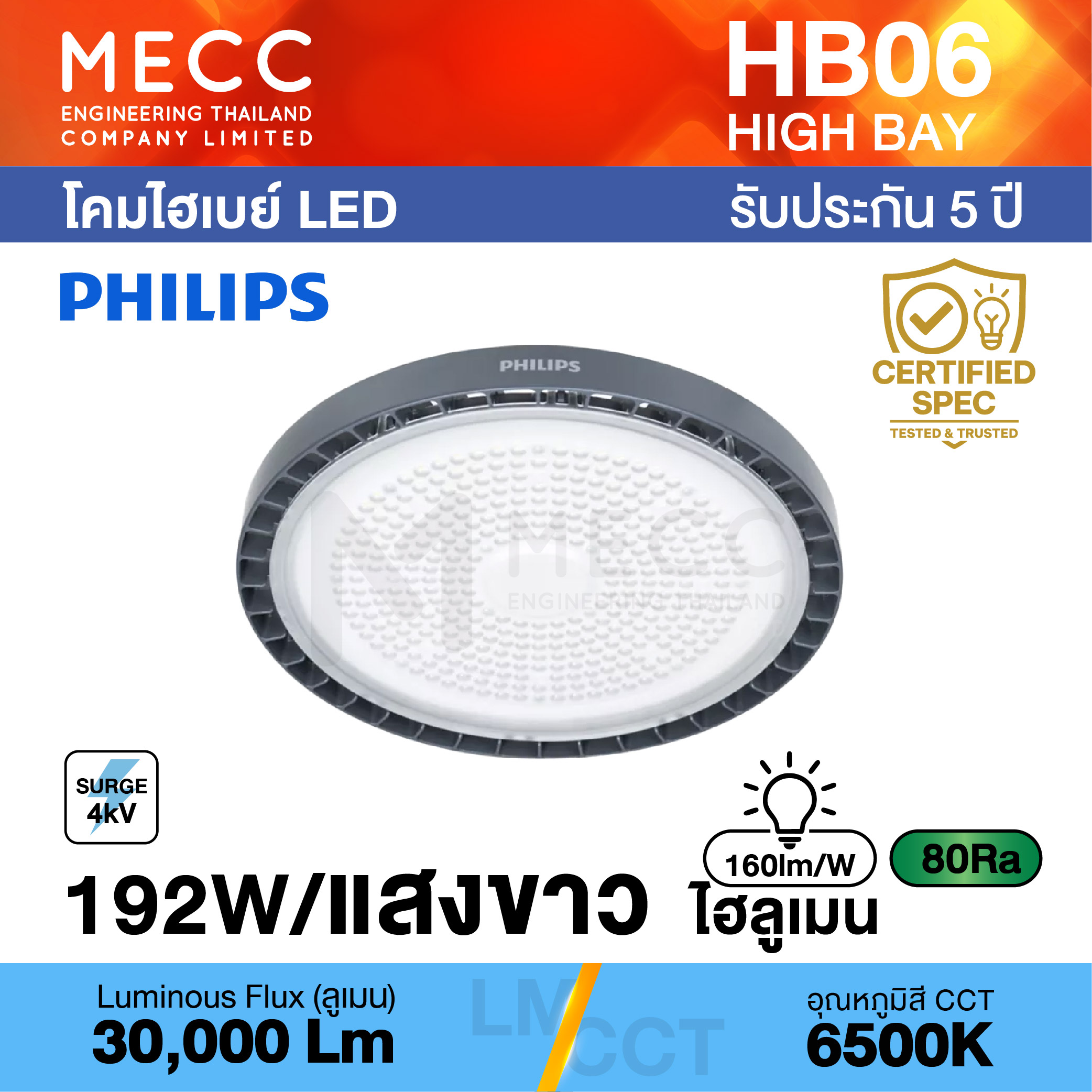 Efficacy : ประสิทธิภาพความส่องสว่าง (Lumen/Watt) : 160lm/W