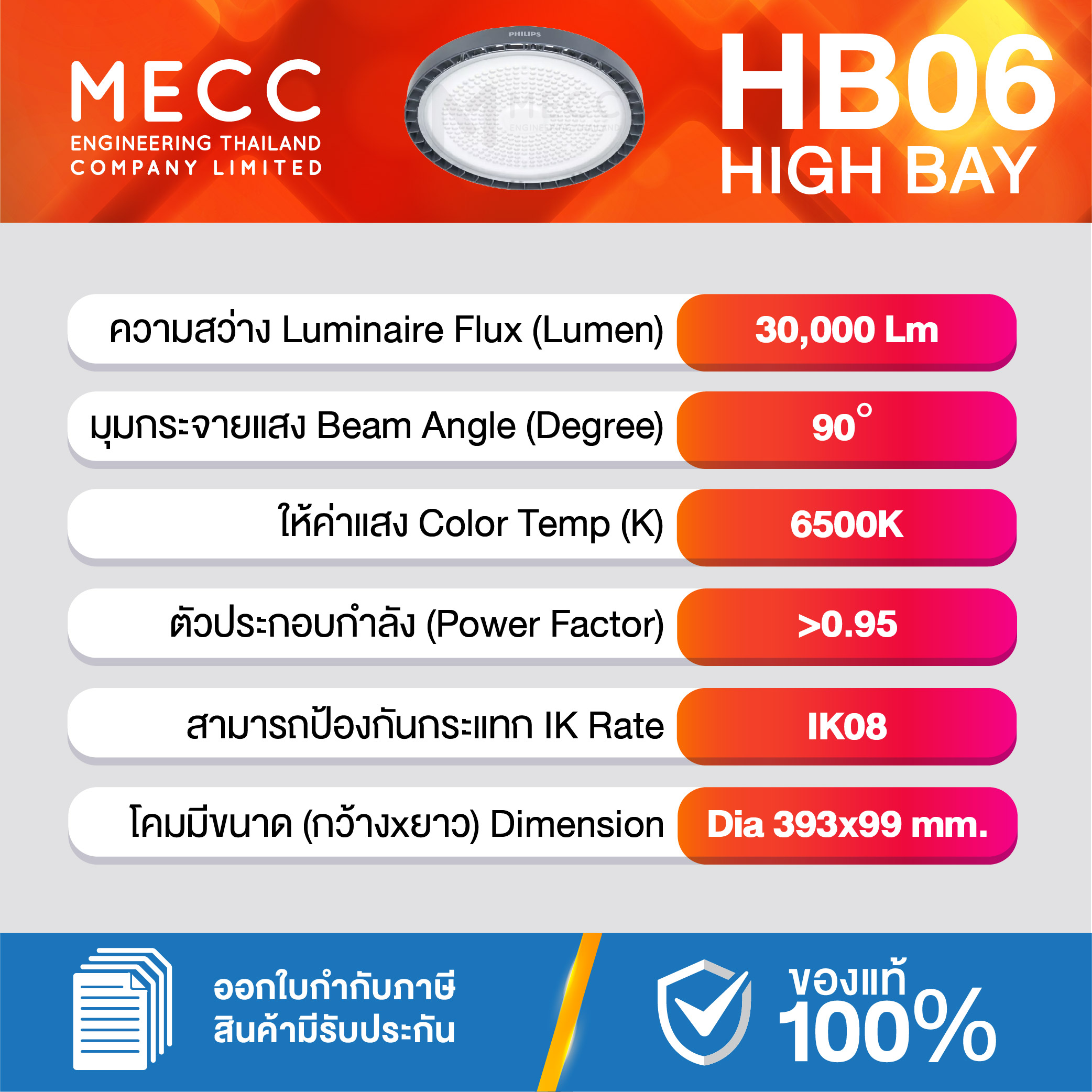 Luminous Flux : ฟลักซ์การส่องสว่าง (Lumen) : 30,000lm