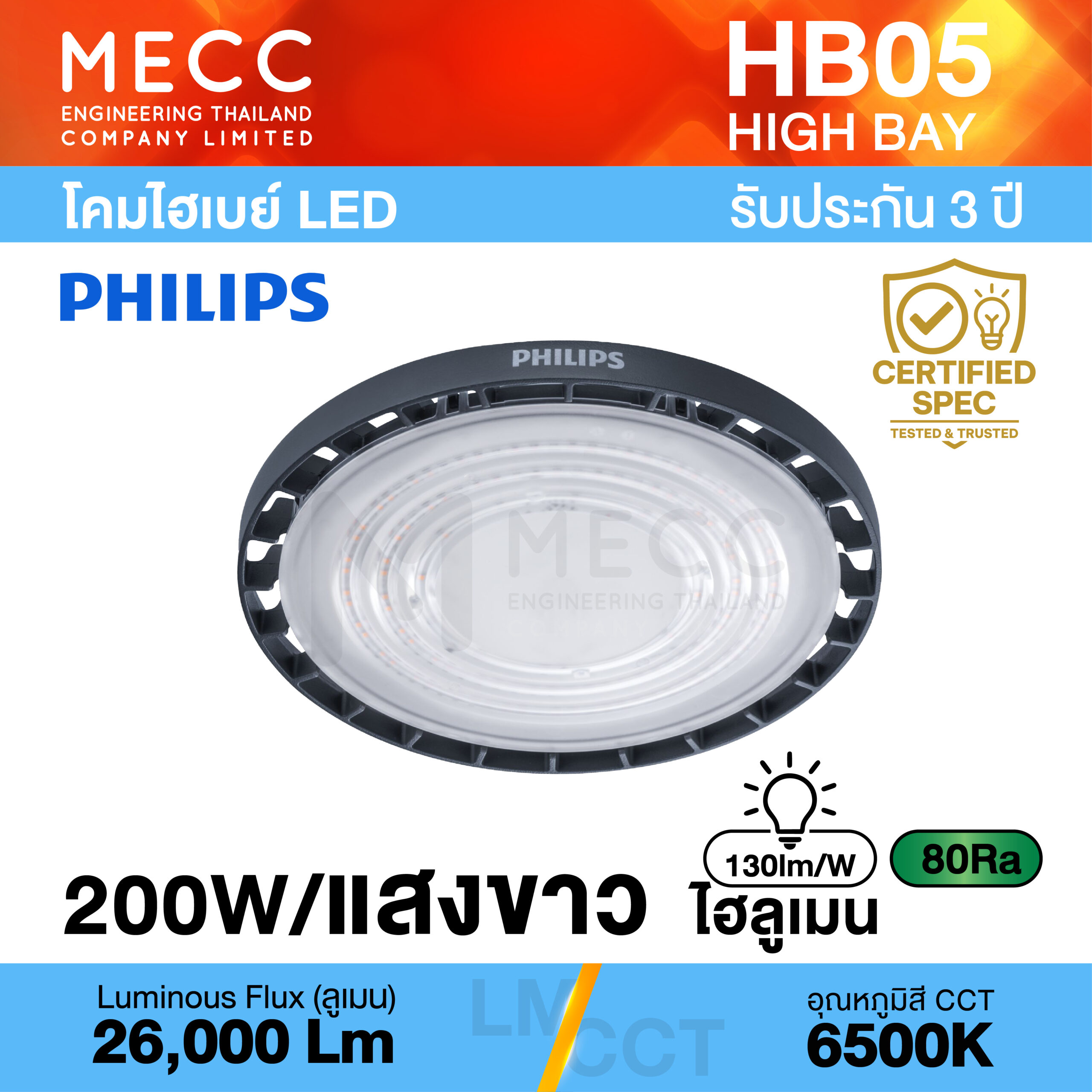 Efficacy : ประสิทธิภาพความส่องสว่าง (Lumen/Watt) : 130lm/W