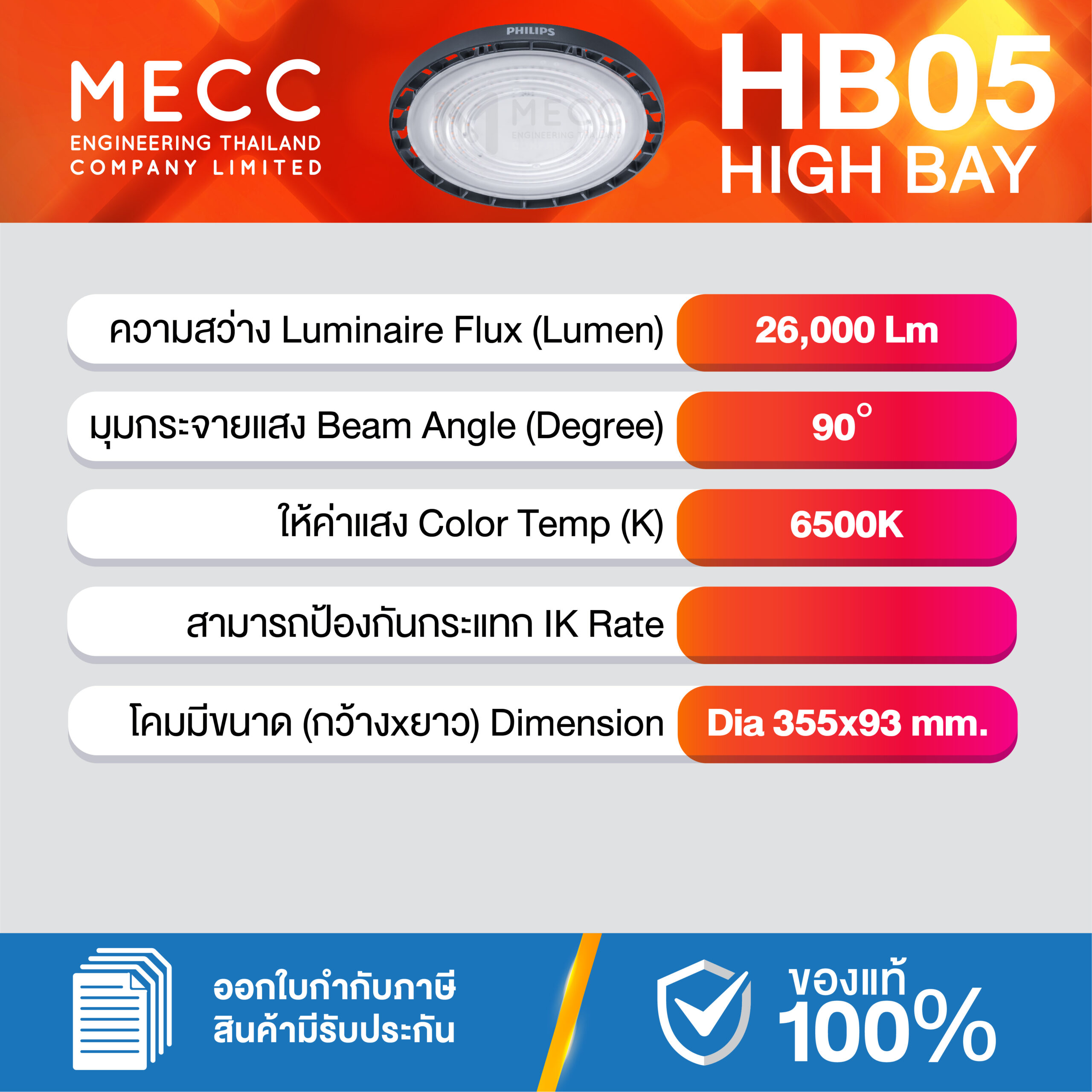 Luminous Flux : ฟลักซ์การส่องสว่าง (Lumen) : 26,000lm