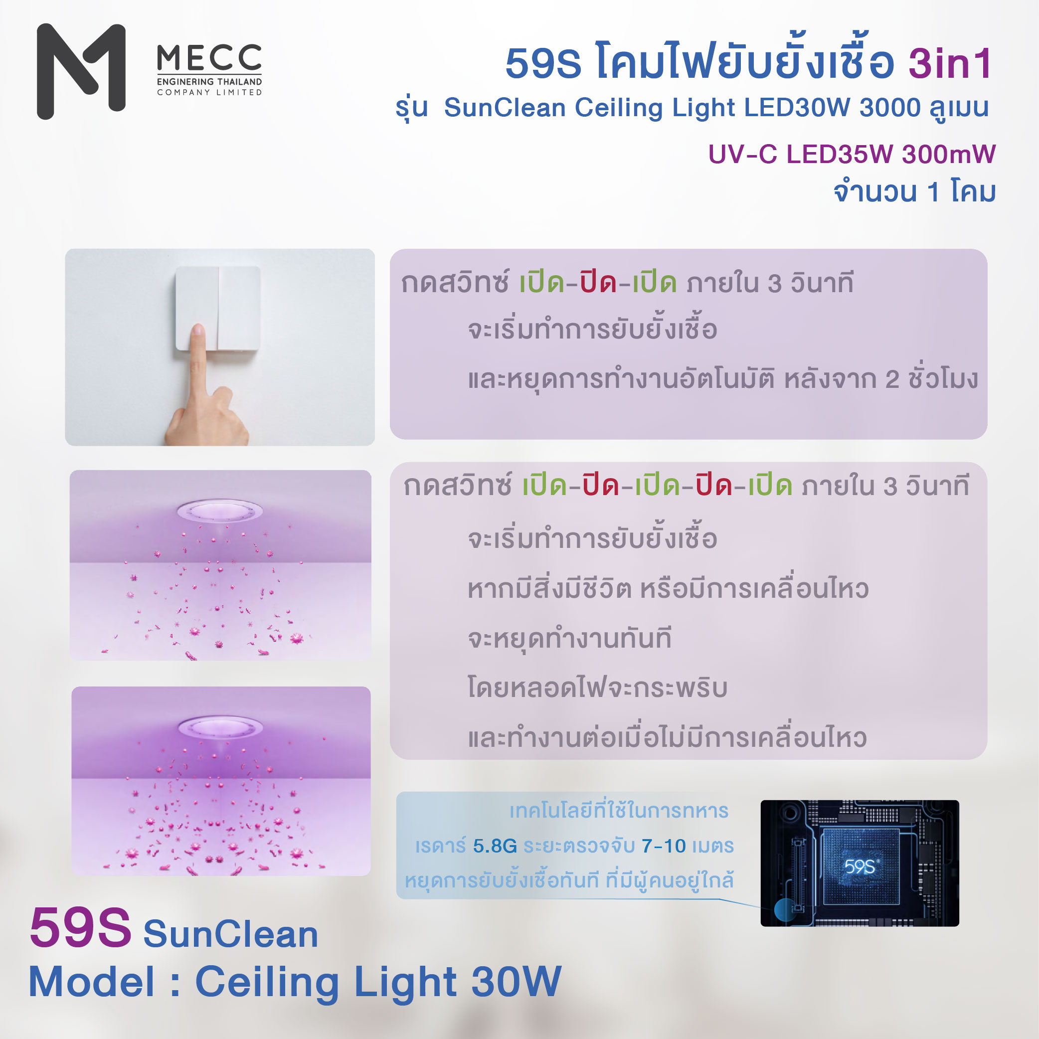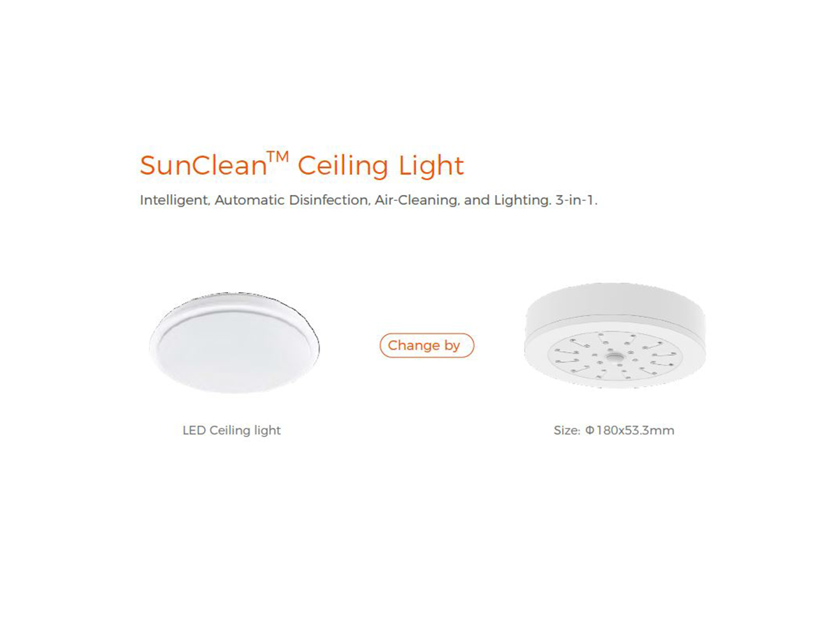 – หลอดไฟและโคมไฟ 3-in-1 ที่สามารถให้แสงสว่าง, ยับยั้งเชื้อโรคในอากาศควบคุมโดยการเปิดปิดสวิตช์ และ สามารถเปิดการทำงานยับยั้งเชื้อโรคในอากาศแบบอัตโนมัติได้เมื่อไม่มีคนอยู่และไม่ตรวจพบความเคลื่อนไหว