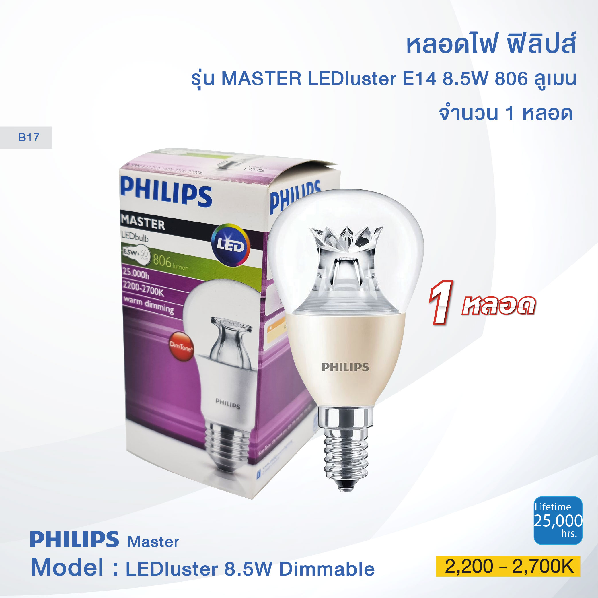 PHILIPS Master LED Luster 8.5W E14 P48 2200-2700K *DIMMABLE* (ฟิลิปส์ หลอดไฟMaster ชนิดหลอดลัสเตอร์ 8.5W ขั้วE14 ทรงP48 แสงวอร์ม  *ปรับหรี่ได้*)